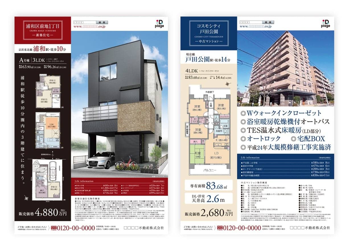 ディー,プラージュでは、デザインから印刷、新聞折込、DM発送、ポスティング手配まで、一括して対応可能です。 ポスター・チラシ・パンフレット・名刺等、紙媒体であれば何でもご対応いたします。 また、不動産広告管理者が在籍しており、これまでに不動産広告も多数手がけております。 記載のない商品やサイズについても制作を承っておりますので、お気軽にご相談下さい。