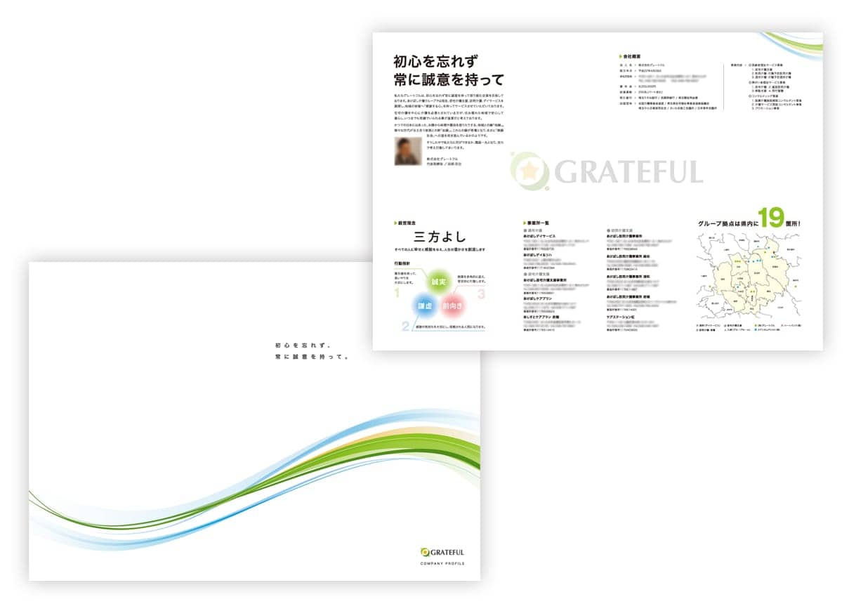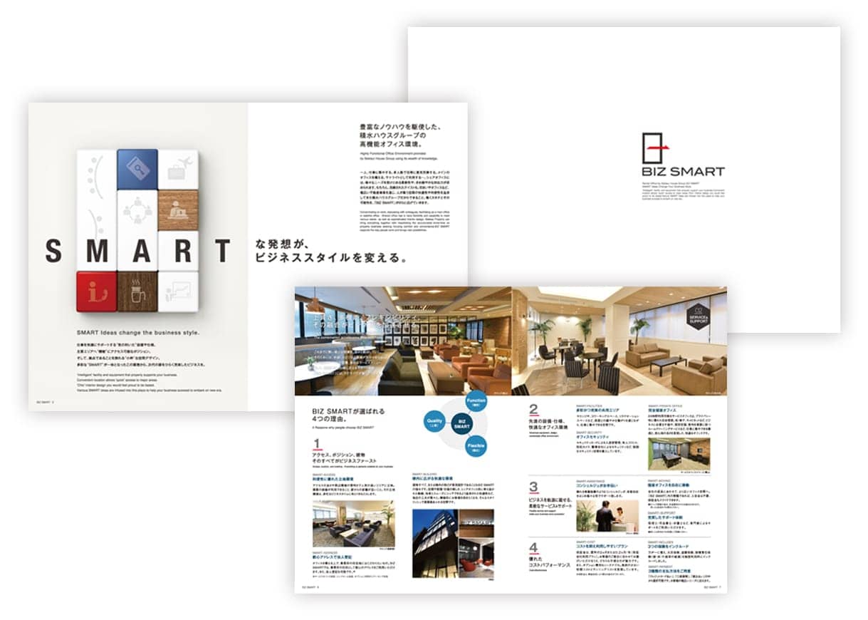 会社案内や採用案内パンフレットから、商品や施設の紹介パンフレットまで。最もスタンダードな形状は、A4サイズ仕上がりの中綴じタイプパンフレットです。